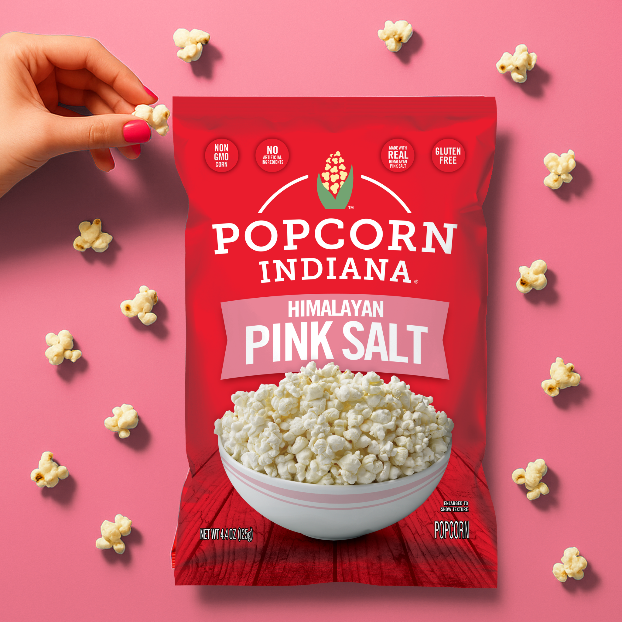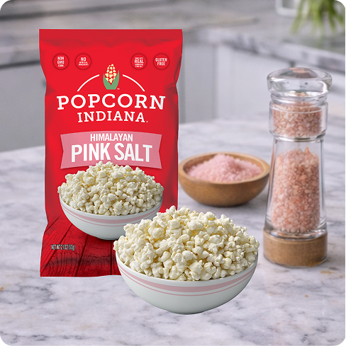Himalayan Mountains, meet Popcorn Indiana. Try our delicious kernels of joy with a subtle taste of salt. We lightly toss our freshly popped kernels with Himalayan pink salt for a clean, bright flavor that lets the popcorn shine, and at just 50 calories per cup, Popcorn Indiana is pretty in pink.